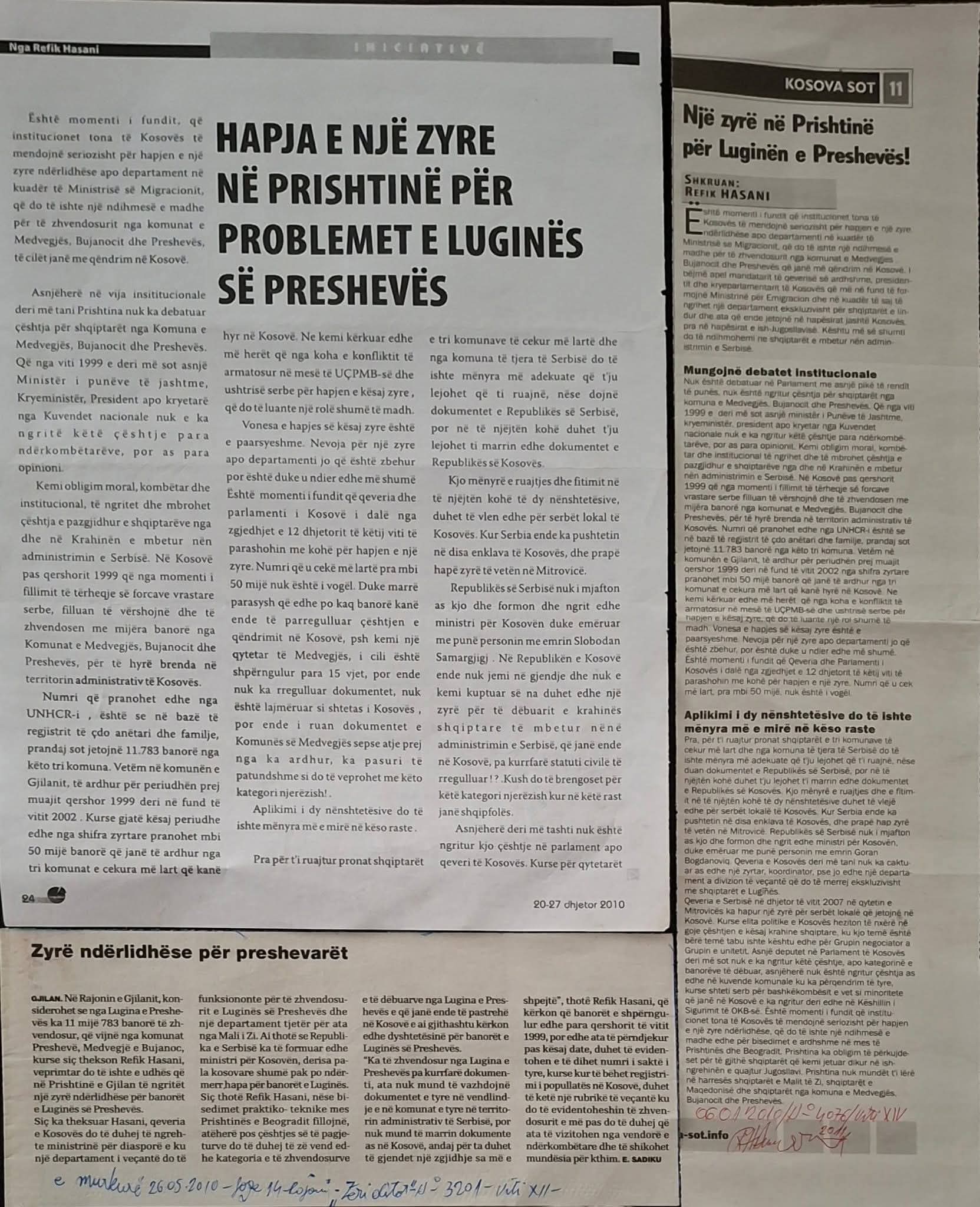 📣Hapja e një zyre ndërlidhëse në nivel të zyrës së Kryeministrit të Kosovës, për Krahinë e Preshevës, është domosdoshmëri kohe, Viti IV-nr.111, botuar datë 29 shtator të vitit 2008, në faqen 19, në revistën javore ‘’Perspektiva’’.