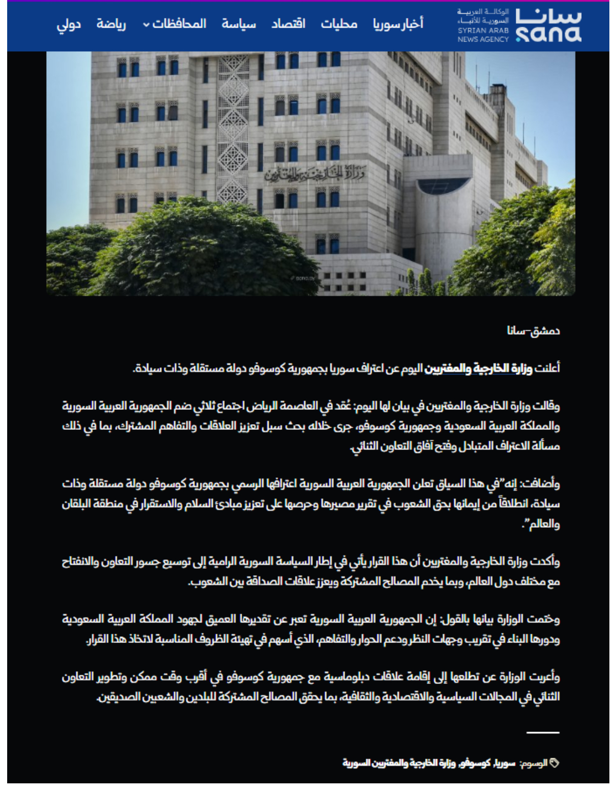 Ministria e Punëve të Jashtme dhe të Emigrantëve tha në një deklaratë sot: “Në kryeqytetin Riad u mbajt një takim trepalësh që përfshinte Republikën Arabe të Sirisë, Mbretërinë e Arabisë Saudite dhe Republikën e Kosovës, gjatë të cilit u diskutuan mënyrat për forcimin e marrëdhënieve dhe mirëkuptimit të ndërsjellë, përfshirë çështjen e njohjes reciproke dhe hapjen e horizonteve të bashkëpunimit dypalësh.”